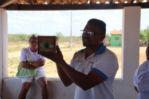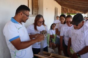 O técnico do Projeto Vale Sustentável, Luciano Bezerra, conduziu uma tarde de muito aprendizado com 28 agricultores e agricultoras, mostrando na prática como realizar a alimentação das abelhas Jandaíra — espécie nativa do nosso Bioma Caatinga e essencial para o equilíbrio da natureza.