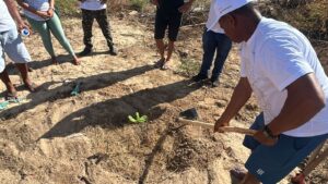 Durante as aulas, os participantes puderam colocar a mão na terra na atividade prática de plantio de um cajueiro, aprendendo sobre o uso de técnicas e ferramentas como o hidrogel, que contribuem para uma agricultura mais eficiente e responsável com os recursos naturais.